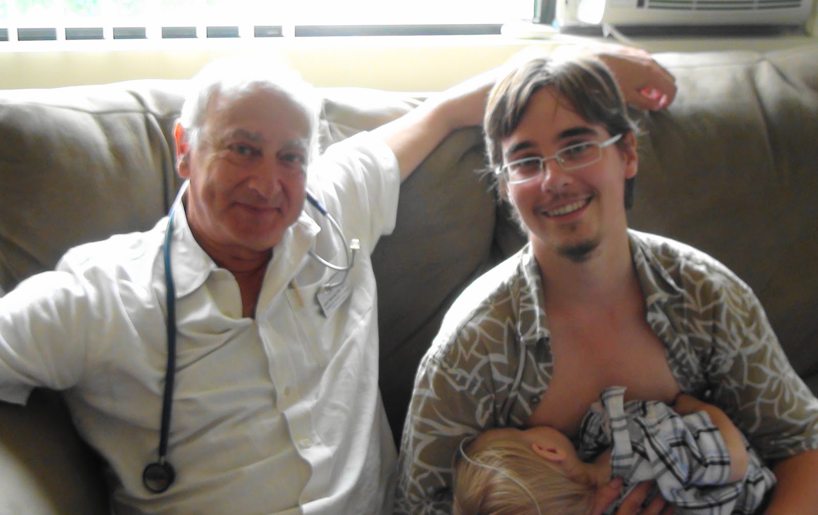 Dr. Newman, wearing a stethoscope, sits beside me on a couch as I nurse Jacob.